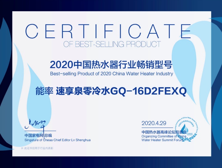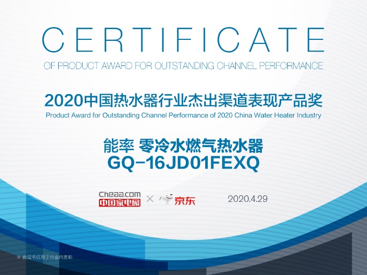 2020年中國熱水器行業杰出渠道表現產品獎