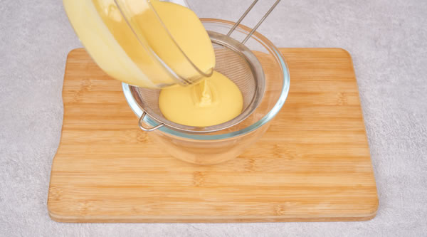 STEP 01將牛奶、食用油、低筋面粉、蛋黃攪勻成蛋黃糊過篩備用 -