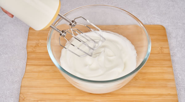 STEP 02蛋清加入檸檬汁、將糖分3次加入,用電動打蛋器打發至細膩光滑可起勾狀 -