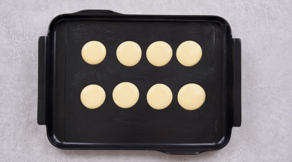 STEP 06用硅膠刷均勻將黃油抹開使其融化,擠入一個個圓形銅鑼燒糊 -