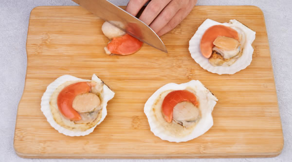 STEP 02扇貝洗凈去半殼,吸干表面水份,正反面開花刀使其入味 -