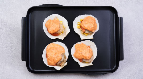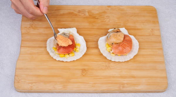 STEP 03每只底殼放10g玉米粒,放入扇貝肉,研磨黑胡椒,頂部放上約30g明太子醬 -