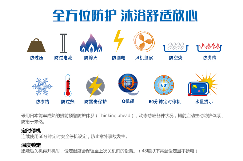 安全裝置:熄火安全、防空燒安全、停電時安全、防過熱、防過電流、防過壓安全、風扇轉速檢測、防沸騰、防漏電安全、60分鐘定時停機保護、防凍裝置