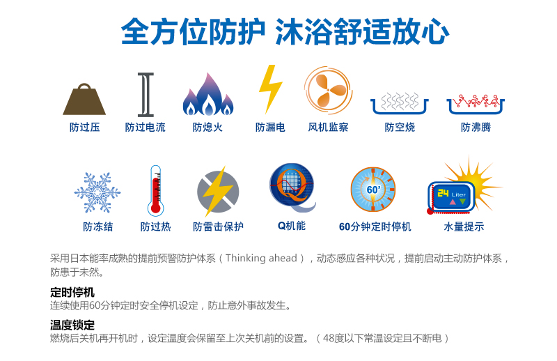 安全裝置:熄火安全、防空燒安全、停電時(shí)安全、防過熱、防過電流、防過壓安全、風(fēng)扇轉(zhuǎn)速檢測、防沸騰、防漏電安全、60分鐘定時(shí)停機(jī)保護(hù)、防凍裝置