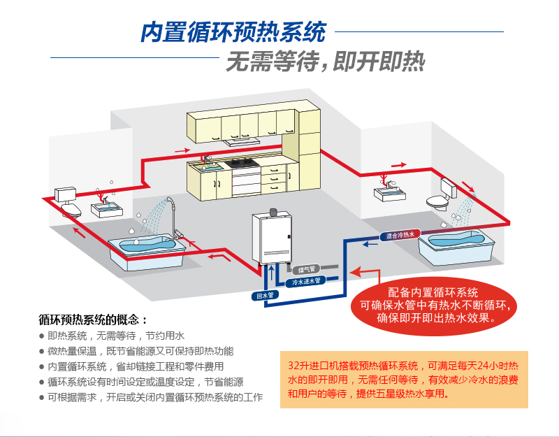 - 內(nèi)置預(yù)熱循環(huán)系統(tǒng),熱水即開即來