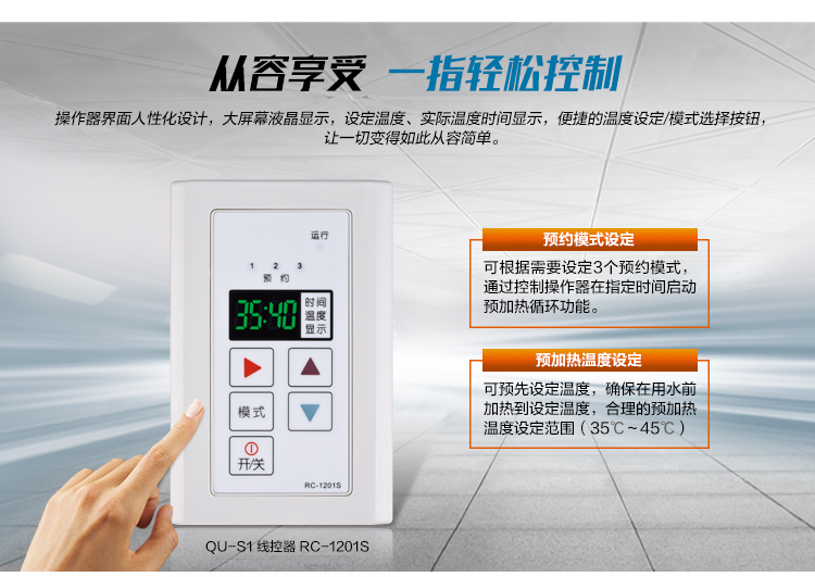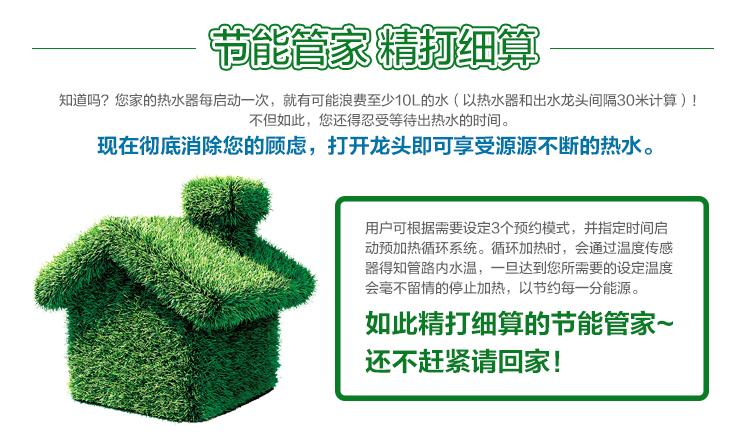 優(yōu)勢功能: 熱水即開即來,無需等待;可設(shè)定3個預(yù)約模式,在指定時間啟動預(yù)熱循環(huán)功能;預(yù)加熱溫度設(shè)定;智能防凍