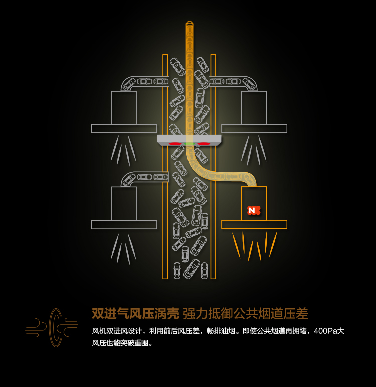 - 雙進氣風壓渦殼,強力抵御公共煙道壓差