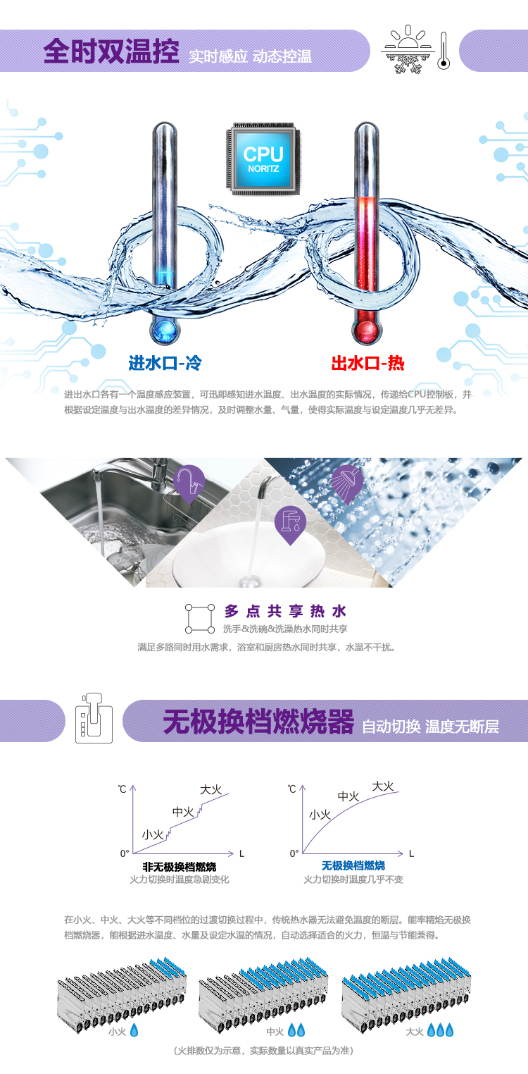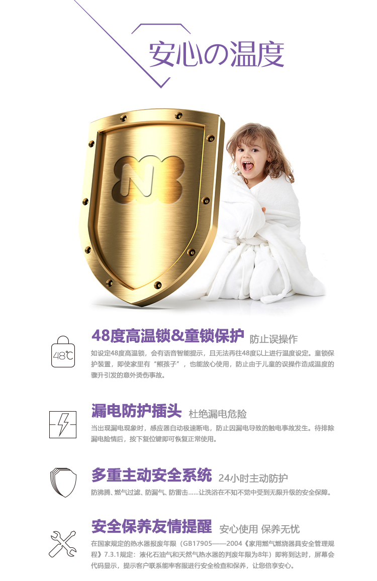 安全裝置:熄火保護、過壓保護、可復式空燒保護、水及氣路過濾、熔斷式過熱保護、LED數碼故障顯示、斷水保護、防雷擊保護、雙重燃氣電磁閥等等安全保護裝置。