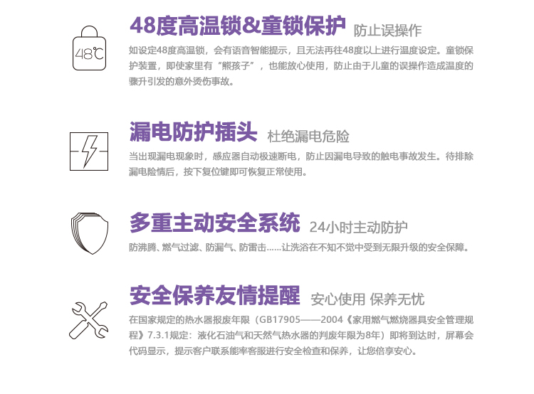 安全裝置:熄火保護、過壓保護、可復式空燒保護、水及氣路過濾、熔斷式過熱保護、LED數碼故障顯示、斷水保護、防雷擊保護、雙重燃氣電磁閥等等安全保護裝置。