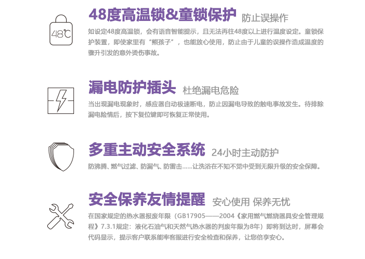 安全裝置:熄火保護、過壓保護、可復式空燒保護、水及氣路過濾、熔斷式過熱保護、LED數碼故障顯示、斷水保護、防雷擊保護、雙重燃氣電磁閥等等安全保護裝置。