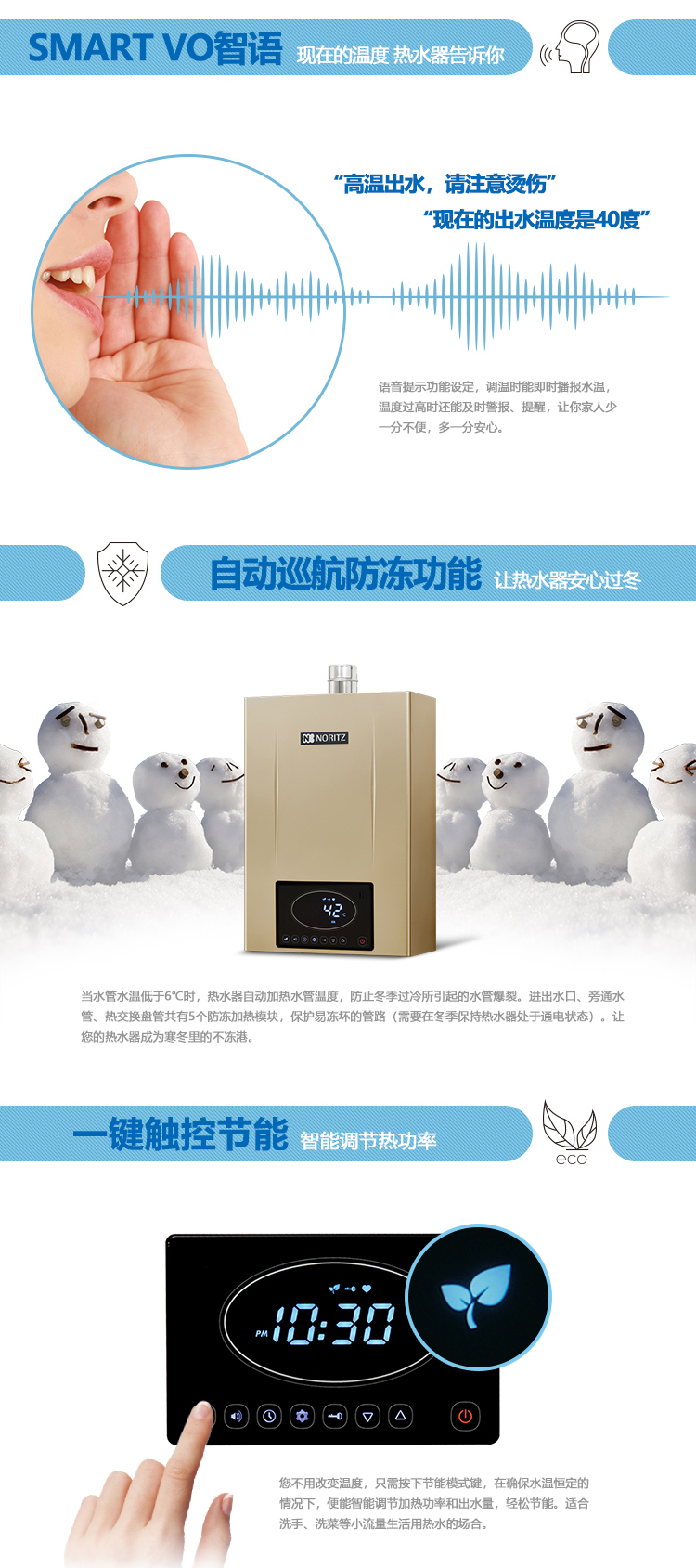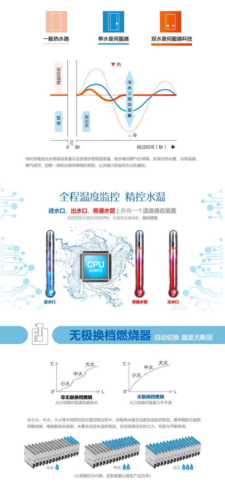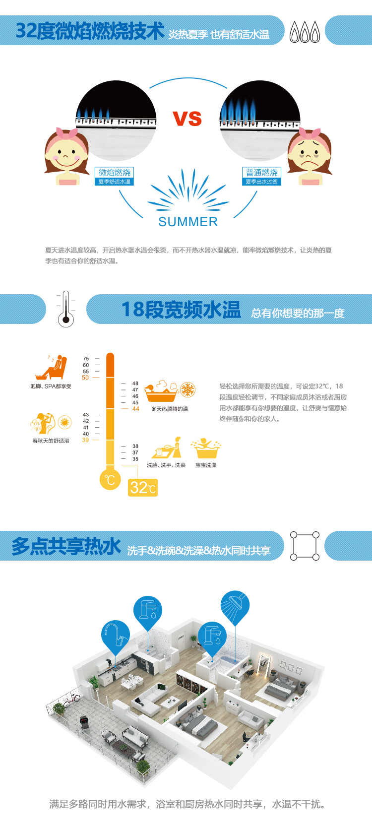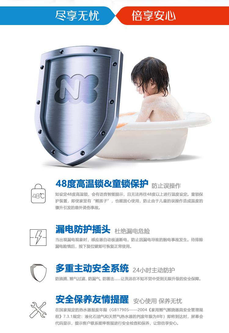 安全裝置:熄火保護、過壓保護、可復式空燒保護、水及氣路過濾、熔斷式過熱保護、LED數碼故障顯示、斷水保護、防雷擊保護、雙重燃氣電磁閥等等安全保護裝置。