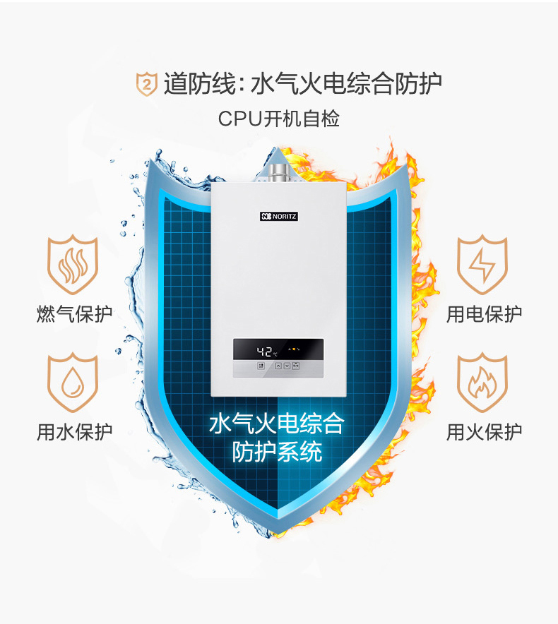 安全裝置:熄火保護(hù)、過(guò)壓保護(hù)、可復(fù)式空燒保護(hù)、水/氣路過(guò)濾、熔斷式過(guò)熱保護(hù)、LED數(shù)碼故障顯?、斷水保護(hù)、防雷擊保護(hù)、雙重燃?xì)怆姶砰y等安全保護(hù)裝置