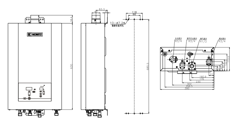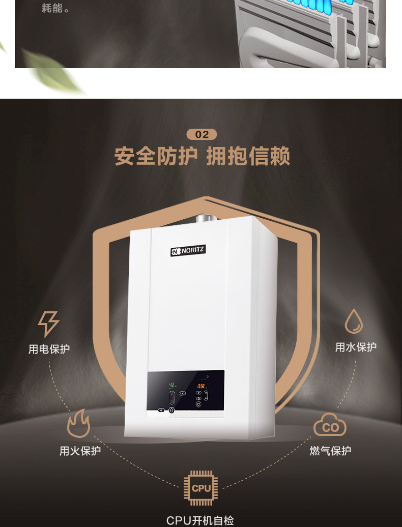 安全裝置:熄火保護、過壓保護、可復式空燒保護、水及氣路過濾、熔斷式過熱保護、LED數碼故障顯示、斷水保護、防雷擊保護、雙重燃氣電磁閥等安全保護裝置