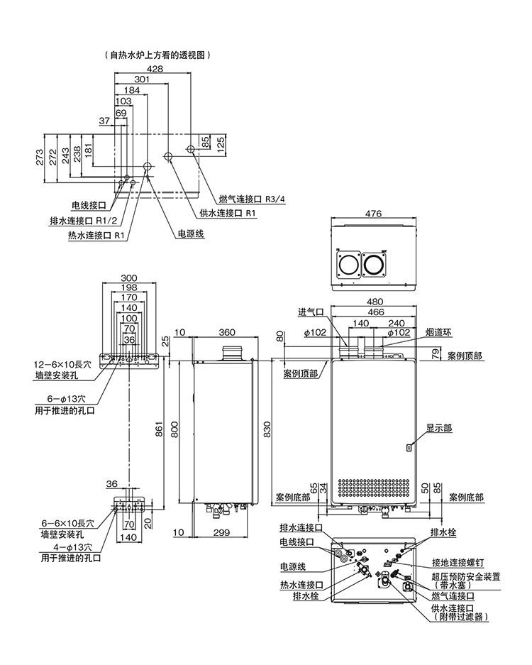 安全裝置:熄火安全裝置、防空燒安全裝置、停電時安全裝置、過熱安全裝置、防過電流裝置、防凍裝置、防過壓安全裝置、風機轉速檢測裝置、防沸騰裝置,防漏電安全裝置、導向防雷裝置、中和器堵塞檢測裝置