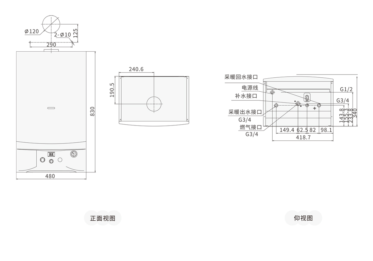 接口:燃氣 DN20、采暖進出水 DN20、補水口 DN15
