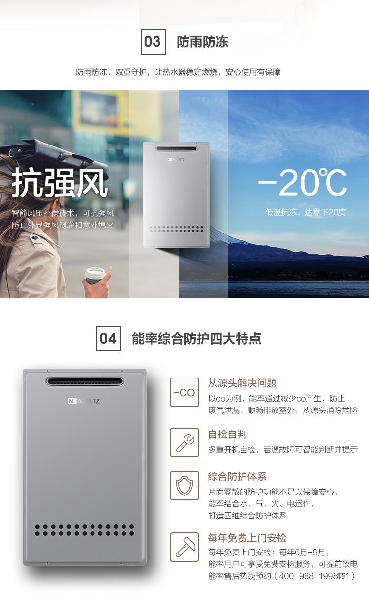 安全裝置:熄火安全裝置、防空燒安全裝置、停電安全裝置、防過熱裝置、防過電流裝置、防凍結裝置、防過壓安全裝置、風機轉速檢測裝置、防沸騰裝置、定時停機保護、無線電干擾濾波器安全裝置